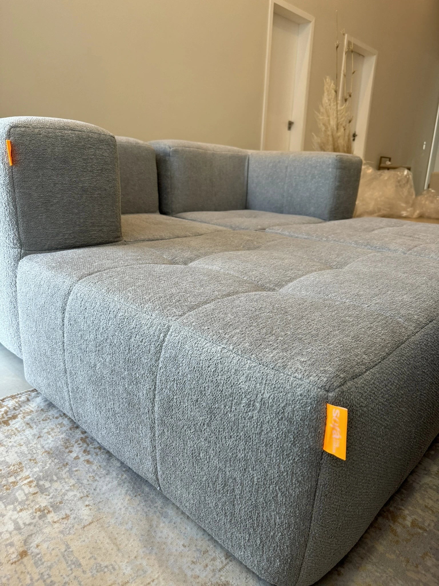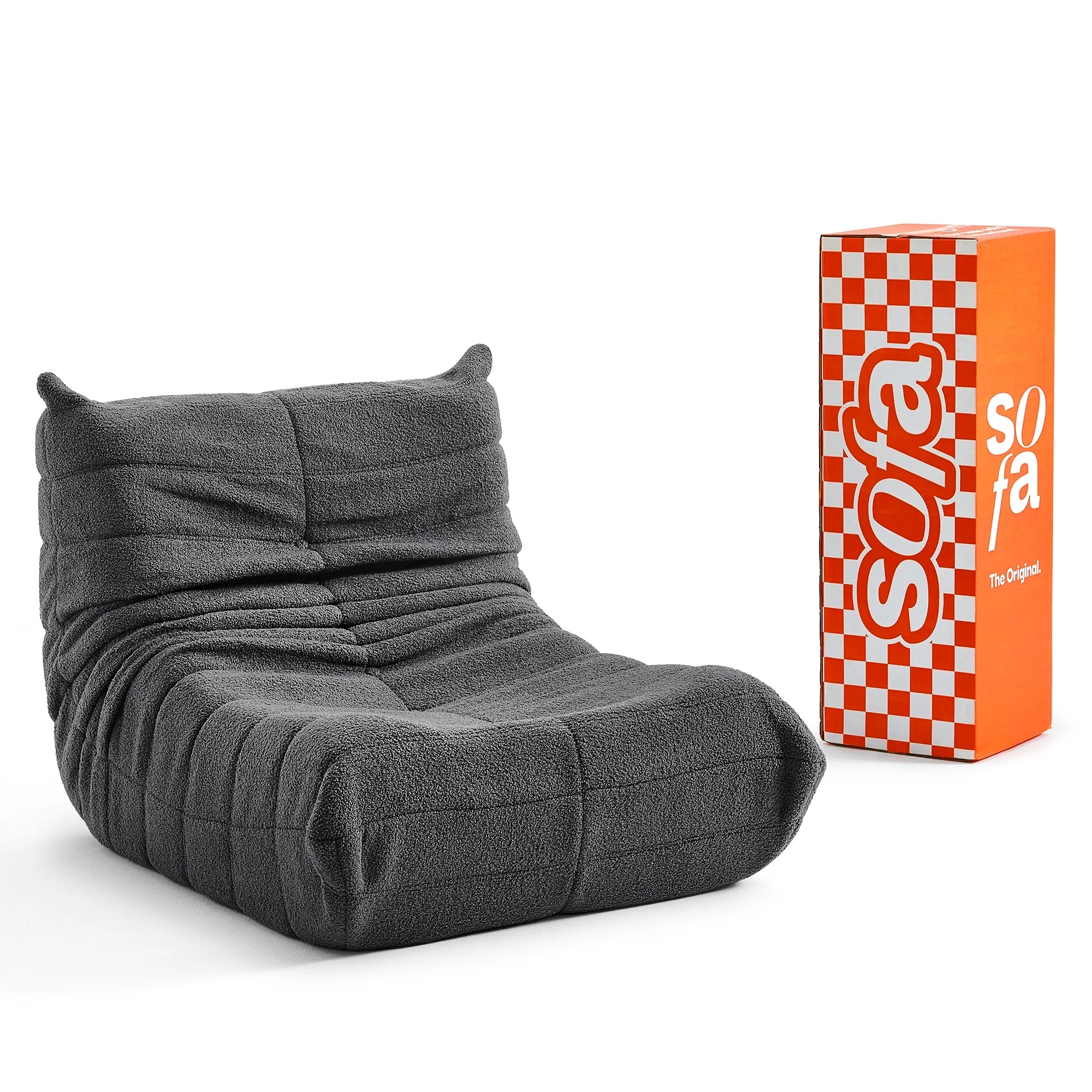 O Sofá na Caixa possui um tecido selecionado por especialistas: um boucle sofisticado com alta resistência a arranhões de gatos, tornando-o pet